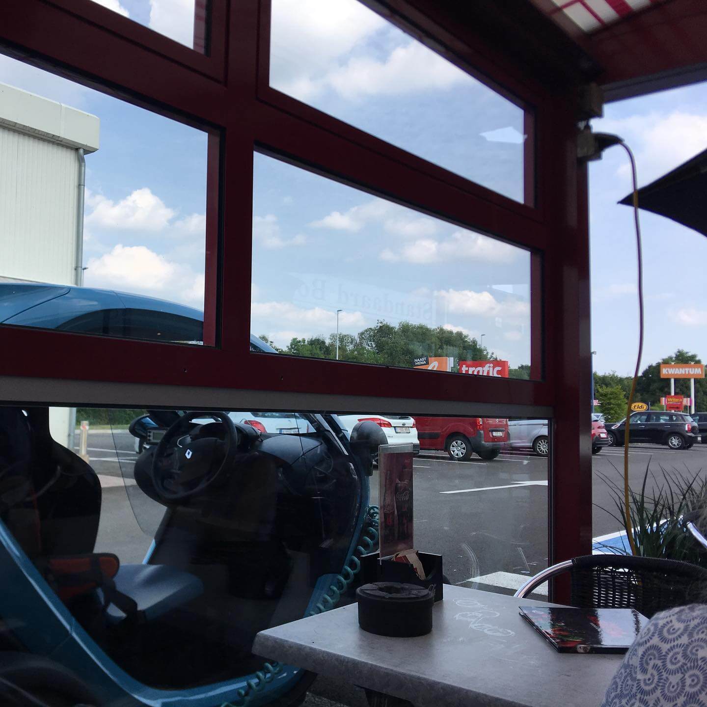 Gegen halb fünf statt wie geplant gegen 13 Uhr, fanden die beiden nach langem Suchen eine Lademöglichkeit in Sint-Joris-Winge, wo sie vom Wirt des Gouden Punt freundlicherweise Zugang zum Strom zwecks Laden der Akkus bekamen – beides dokumentiert von Guido, der daraus Lektion 1 des Tages folgerte: „Man sollte die Etappen nur so lang planen wie der Akku hält.“